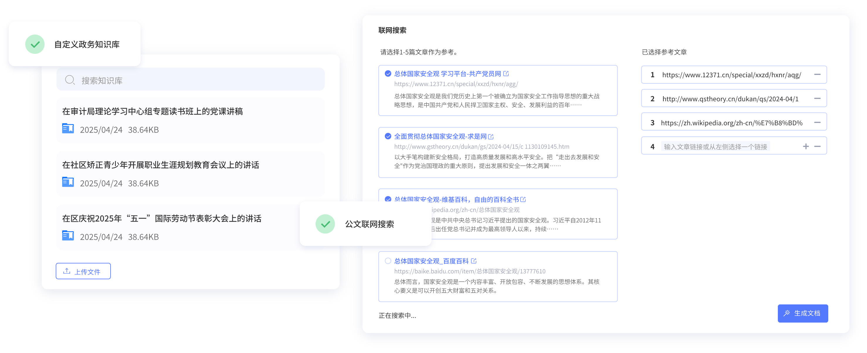 上傳政務(wù)或個(gè)人寫作常用材料,用于精準(zhǔn)生成符合自己寫作風(fēng)格的公文